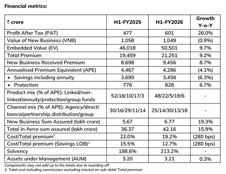 · Claim Settlement Ratio: Claim settlement ratio stood at 99.3% with an average turnaround time of 1.1 days for non-investigated individual death claims in H1 FY2026.