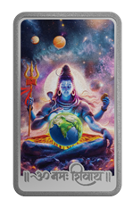 This silver bar is a spiritual masterpiece, a visual embodiment of Lord Shiva’s cosmic power, serenity, and divine guardianship. Crafted with the Finest Swiss Craftmanship blended with India’s rich artistic heritage, the front side of the bar showcases Lord Shiva seated in a meditative pose amid a celestial backdrop. His aura radiates calm strength as he cradles the planet Earth in his hand, symbolizing his role as the protector and creator of balance in the universe. Surrounding him are cosmic elements like galaxies, planets, sacred symbols such as the Trishul and Damru, and intricately designed motifs representing the boundless energy of Shiva.