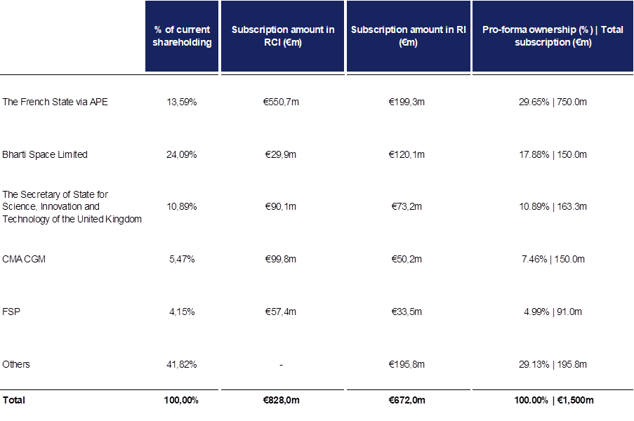 The Reserved Capital Increase would amount to €828 million, to be subscribed by the French State via APE for €551 million, Bharti Space Limited for €30 million, His Majesty’s Government for €90 million, CMA CGM for €100 million, and FSP for €57 million. The subsequent Rights Issue would amount to €672 million.